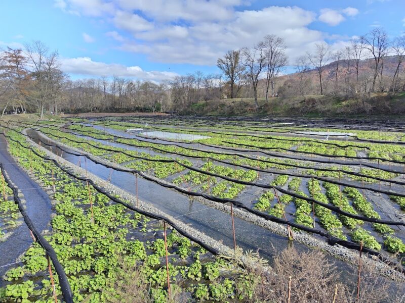 ここは日本最大級のわさび農場で、澄んだ湧き水の流れる美しい景観が広がっています。