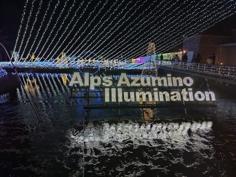 冬季限定で開催されるイルミネーションは、北アルプスをテーマにした壮大な光の演出が見どころです。