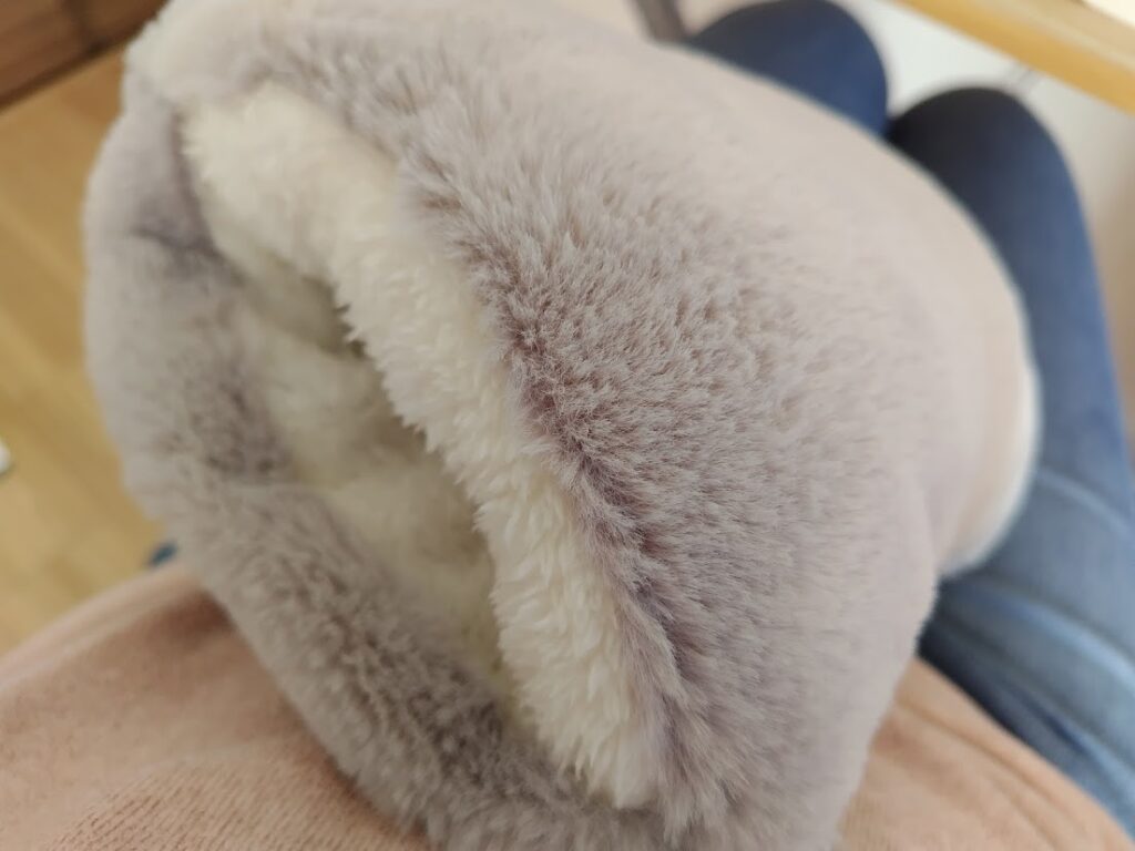 カバーはふわもこで気持ちよく、まるでぬいぐるみを抱いているような安心感。毛が少し抜けやすい点はありますが、それ以上に使い心地の良さが際立っています。