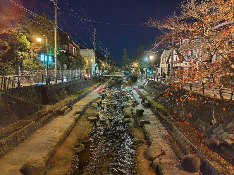また、夜になると、川沿いの灯りが幻想的に揺れ、石橋の上には柔らかな光が灯ります。